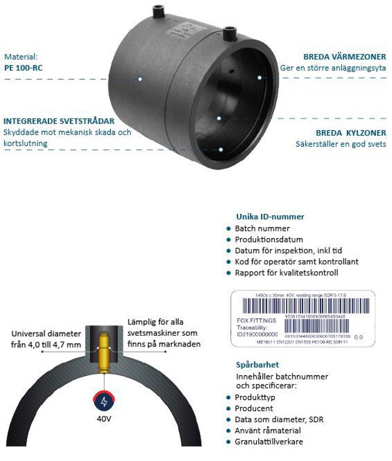 Innovatiiviset sähköhitsausosat PE100-RC-materiaalista, jotka voidaan hitsata kaikilla markkinoilla olevilla sähköhitsauskoneilla.