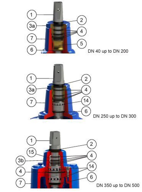 - Kammiorenkaat, jotka kiinnittävät kierrevarren ja tarjoavat matalan sulkeutumismomentin Sininen vettä varten (EPDM) Punaruskea viemäreitä varten (NBR)
