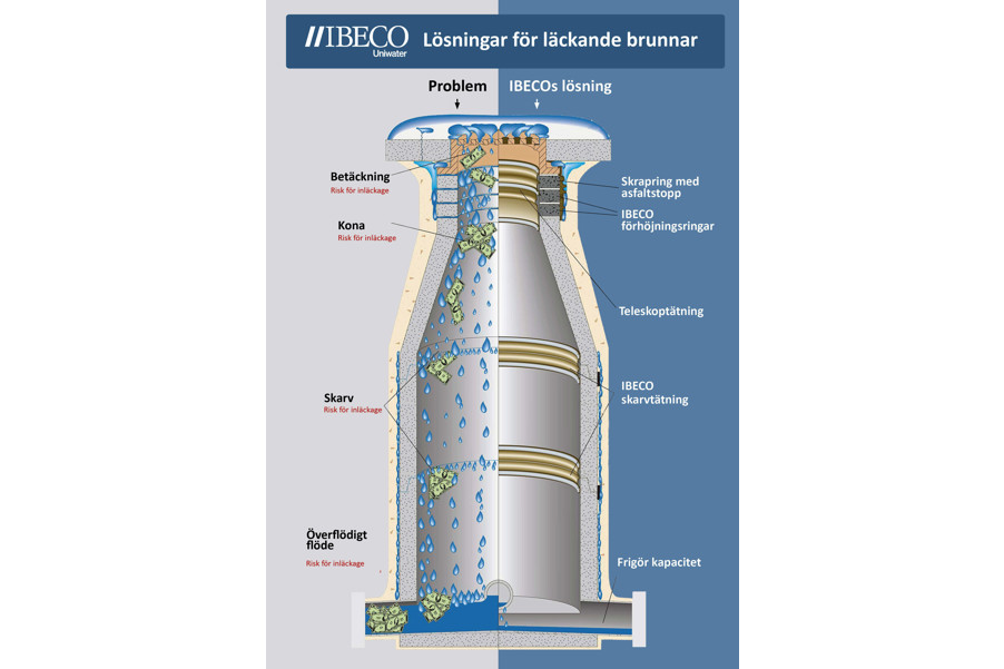 IBECOs teleskoptätning förhindrar infiltrering av grundvatten mellan t.ex förhöjningsringar, betäckningar och brunnskoner. Genom sin flexibla konstruktion och teleskopeffekt kan en enda produkt användas i många olika unika brunnar. Material i brunn, förhöjningsring eller betäckning spelar ingen roll. Snabb och enkel installation gör detta till en av de enklaste lösningarna på marknaden för att förhindra inläckage i avlopps- och dagvattensystem. Går att förlänga genom att använda flera teleskoptätningar.
