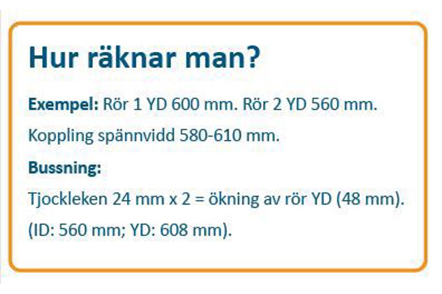 Bussning 1: BC24/500 (ID: 500 mm; YD: 548 mm). Tjockleken 24 mm x 2 = ökning av rör YD (48 mm).