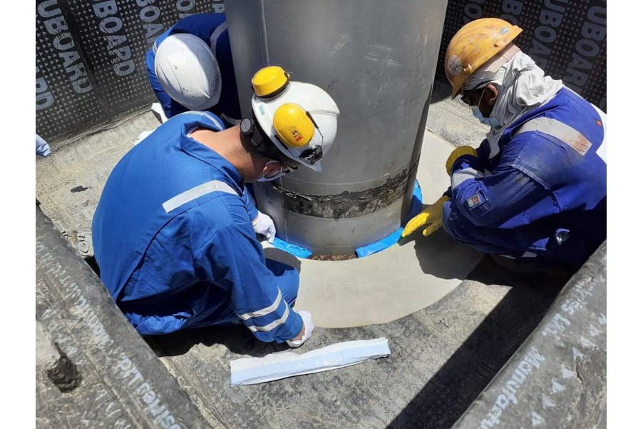 Korrosionsskydd av flänsar eller stålkonstruktioner i mark. Viskoelastiskt korrosionsskydd under och ovan jord som består av ett korrosionsskyddande inre skikt och ett mekaniskt skyddande yttre skikt.