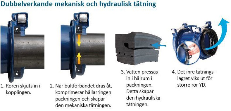 Innovativ rörkoppling för många användningsområden för alla typer av rör. Låg vikt, T-handtag och toppvända bultar gör monteringen enkel, säker och effektiv - en kostnadsbesparande produkt på flera sätt. Patenterad hydraulisk packning som gör tätningen mot rör extra effektiv. Nu med en ny packning där du enkelt kan vika ut packningen för att utnyttja största spännvidden.
