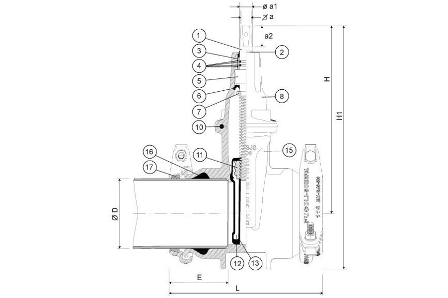 | RSK nr. | DN | Tryck-klass | För rör YDmm | Lmm | Emm | Hmm | H1mm | Spindel(a) mm | a1mm | a2mm | Varv | MaxNm | Viktkg |