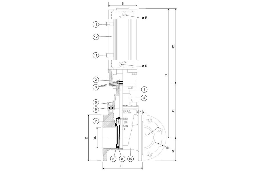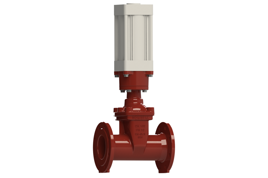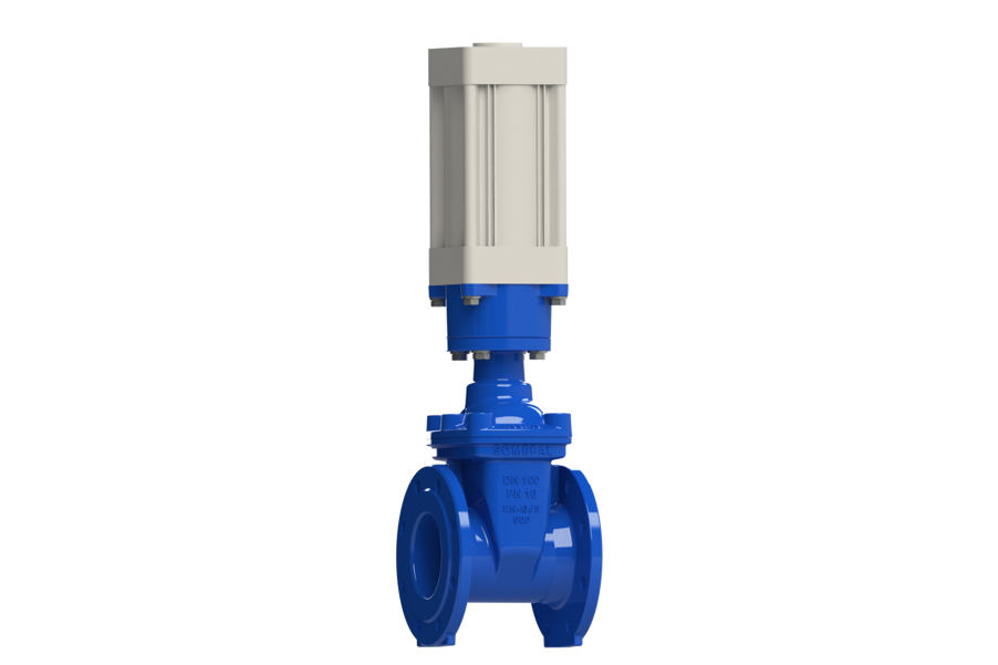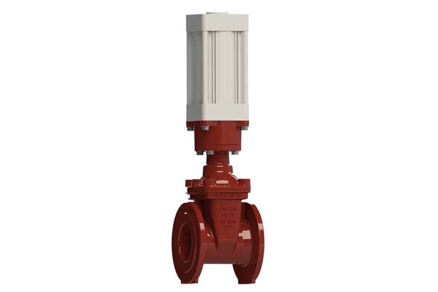 Fucoli-Somepal slussventiler. Med fläns; kort bygglängd F4; pneumatisk aktuator; fritt genomlopp.